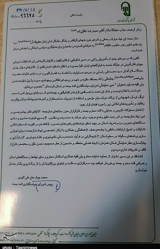 اکنون که در دورهای جدید از مأموریتی ولایی، در مسیر شکوفایی، ارتقای کیفیت و افزایش اثربخشی این تشکیلات نورانی، مهیای نقشآفرینی در جایگاه خدمت به قرارگاههای ایمان، تقوا، بصیرت و اخلاق شدهاید، ضمن تقدیر از تلاشهای موثر جناب حجتالاسلام آقای سید محمدعلی رضایی در دوره مسئولیت، با اعتماد به فضل الهی و در سایهی عنایات حضرت ولی عصر (عجل الله تعالی فرجه الشریف)، جنابعالی را که بحمدالله علاوهبر تعهد و روحیه انقلابی و جهادی، مورد وثوق نماینده معزز ولی فقیه هستید، بهعنوان: «مدیر نمایندگی شورای سیاستگذاری ائمه جمعه در استان کردستان» منصوب مینمایم.
