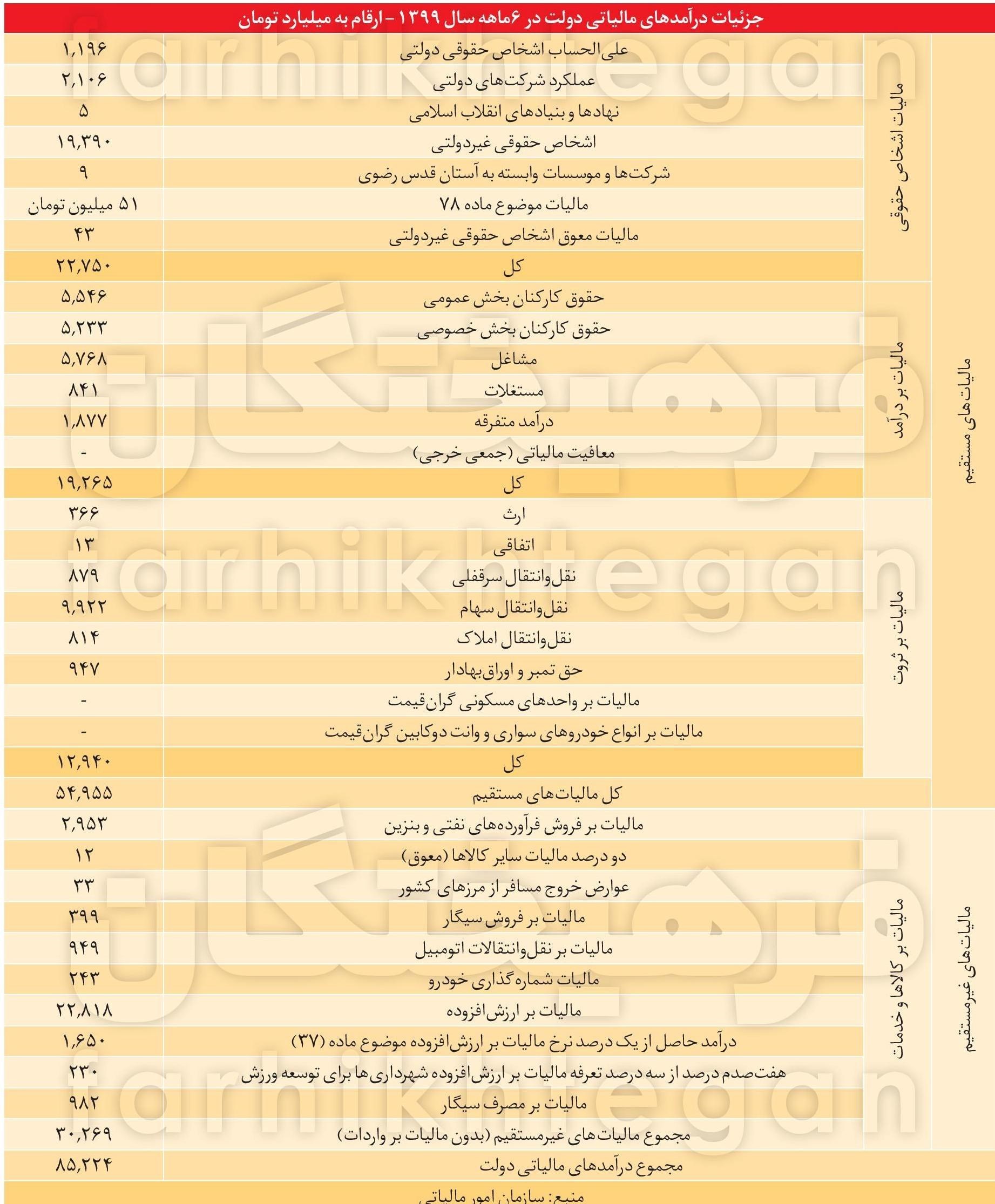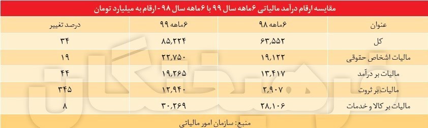 بررسی آمارهای جزئیتر از دادههای سازمان امور مالیاتی نشان میدهد در 6ماهه سال جاری در بخش مالیاتهای مستقیم که شامل مالیات اشخاص حقوقی، مالیات بر درآمد و مالیات بر ثروت است، درمجموع دولت 54هزار و 955میلیارد تومان درآمد داشته و درآمد دولت از مالیاتهای غیرمستقیم نیز 30هزار و 269میلیارد تومان بوده است. در بخش مالیاتهای مستقیم، درآمد دولت از مالیات اشخاص حقوقی یا شرکتها 22هزار و 750میلیارد تومان بوده که نسبت به مدت مشابه سال گذشته (رقم 19هزار و 122میلیارد تومان) رشد 19 درصدی را نشان میدهد. در بخش مالیات بر درآمد که مربوط به مالیات از حقوق و دستمزدها و مشاغل و مستغلات است، درآمد دولت 19هزار و 265میلیارد تومان بوده که نسبت به رقم 13هزار و 417میلیارد تومان 6ماهه سال گذشته رشد 44درصدی را نشان میدهد. افزایش حقوقها از دلایل اصلی این رشد بوده است. مالیات بر ثروت نیز از دیگر پایههای مالیاتی مربوط به مالیاتهای مستقیم است که با رشد 345 درصدی از 2هزار و 907 میلیارد تومان در 6ماهه سال 98 به رقم 12هزار و 940میلیارد تومان در 6ماهه امسال رسیده است.