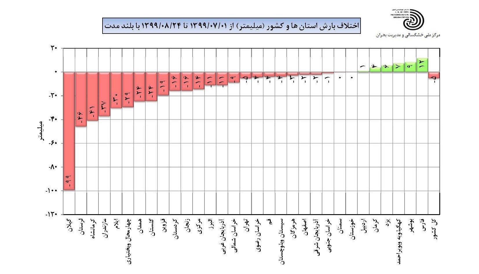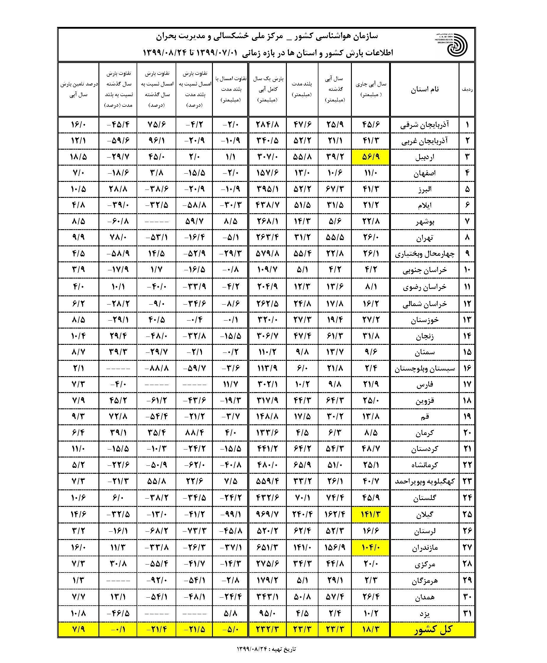 استانهای گیلان (141.3 میلیمتر)، مازندران (104 میلیمتر) و اردبیل (56.9 میلیمتر) پربارشترین و استانهای هرمزگان (2.3 میلیمتر)، سیستان و بلوچستان (2.4 میلیمتر) و خراسان جنوبی (4.2 میلیمتر) کمبارشترین نقاط کشور بودهاند.