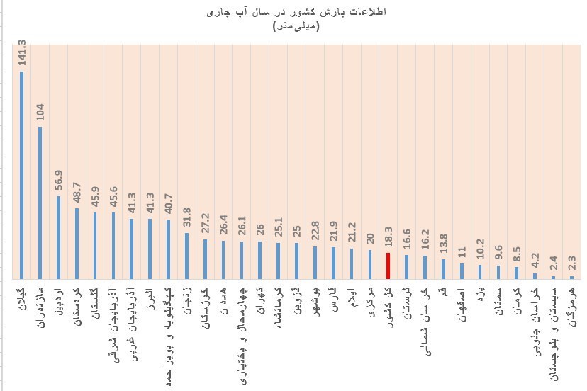 استان فارس با 21.9 میلیمتر هجدهمین استان کشور در میزان بارندگی بوده است و نسبت به مدت مشابه در بلند مدت با 12 میلیمتر افزایش بارش روبهرو بوده است.