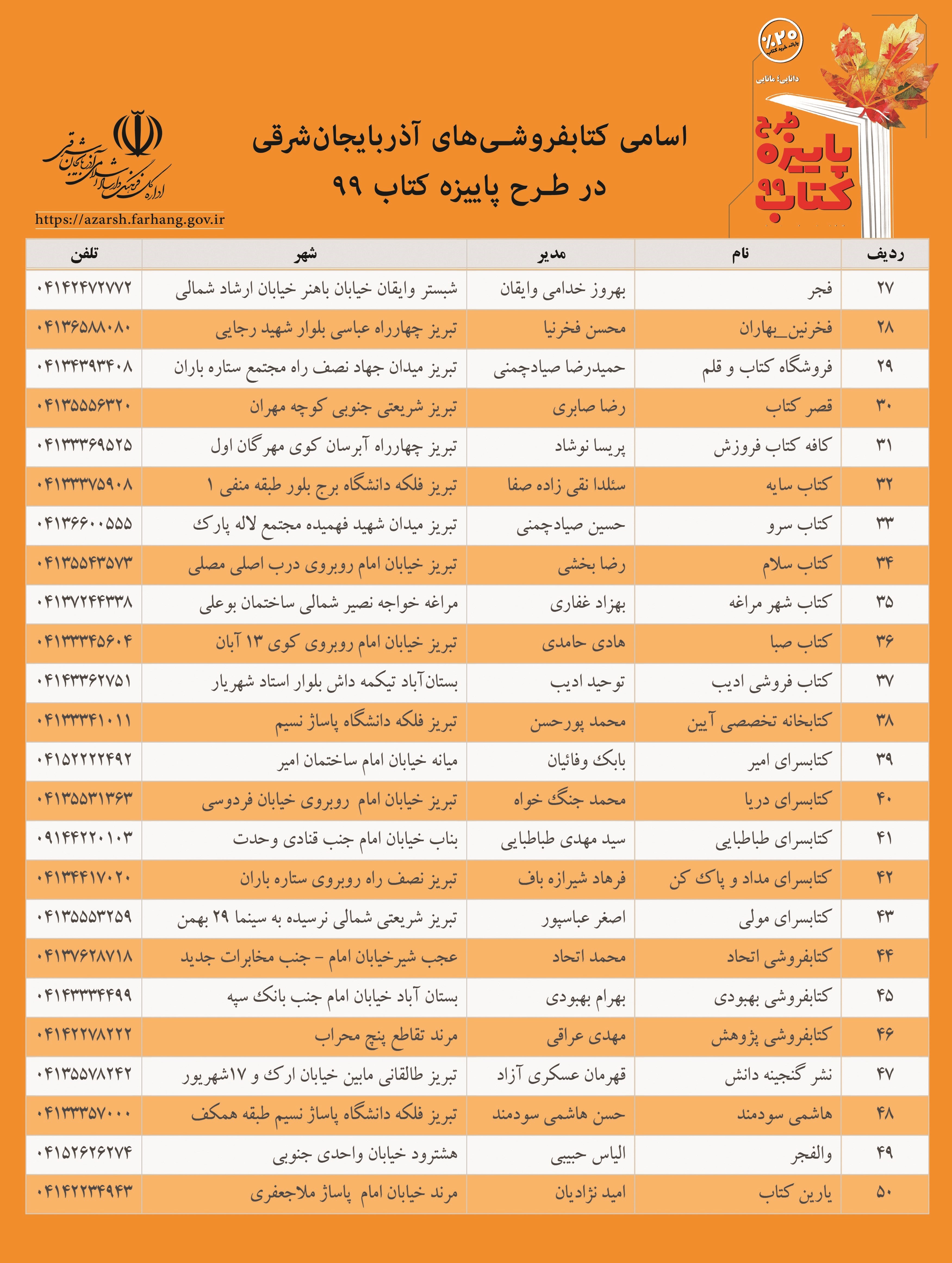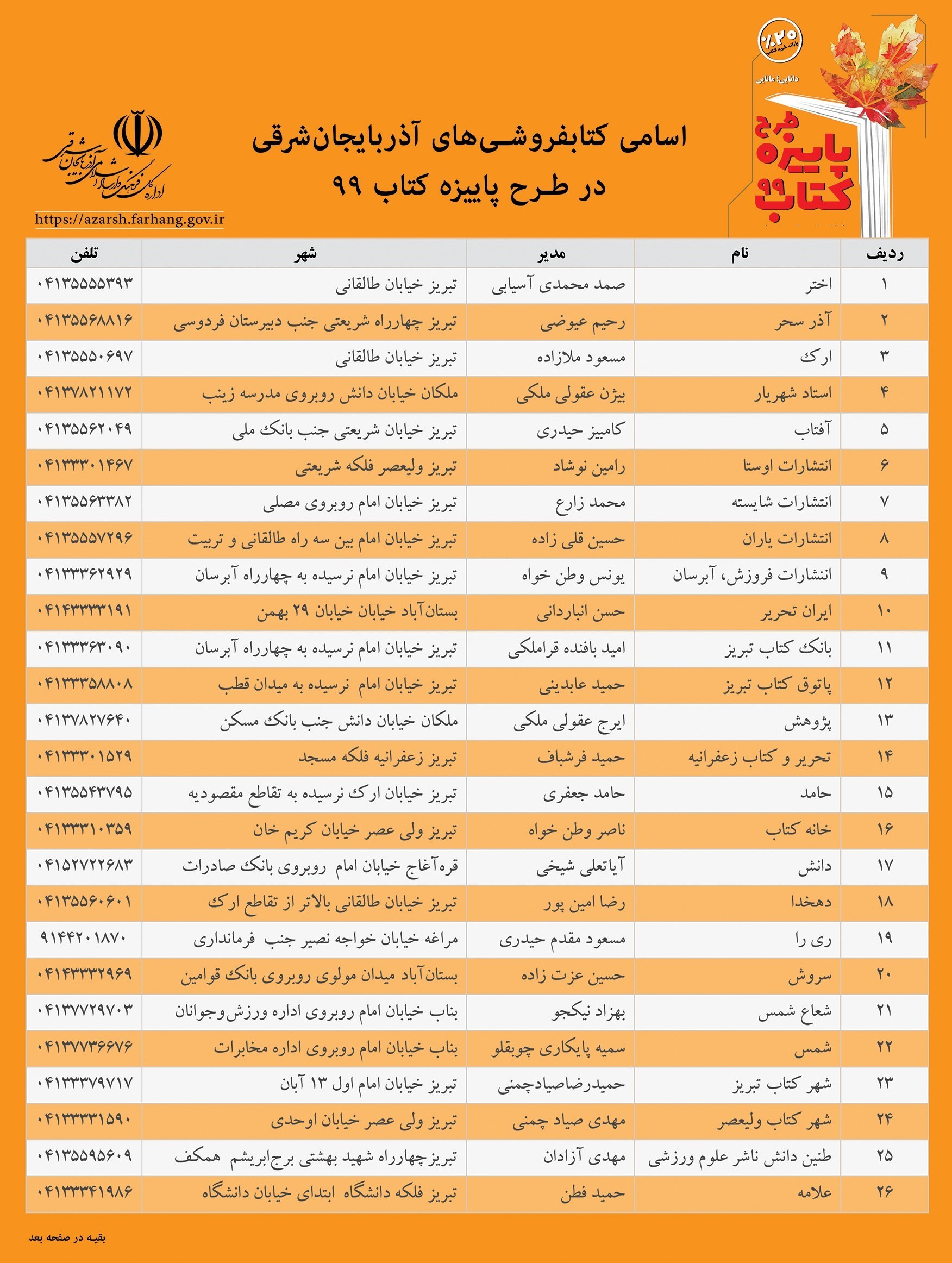 همچنین ری را و کتاب شهر مراغه در مراغه، سروش، بهبودی و ادیب در بستان آباد، شعاع شمس ، طباطبایی و شمس در بناب، فجر در شبستر، امیر در میانه، اتحاد در عجب شیر، پژوهش و یارین کتاب در مرند و والفجر در هشترود در این طرح مشارکت دارند.