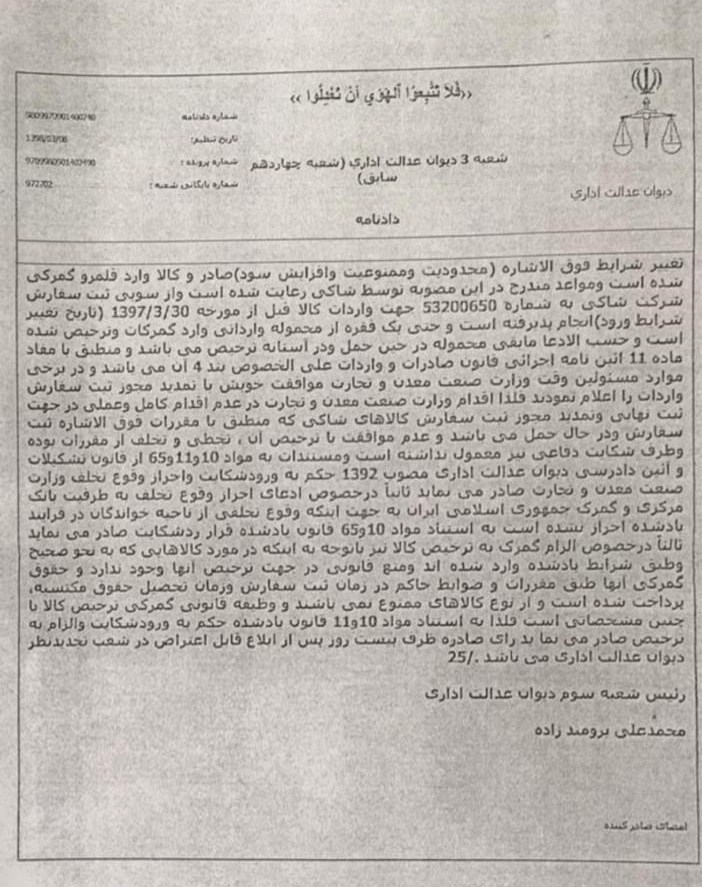 به گزارش خبرنگار اقتصادی خبرگزاری تسنیم، در نامه وزارت صنعت به عباسپور مدیرکل مقررات صادرات و واردات اعلام شده است: احتراماً بهدستور مقام عالی وزارت ایضاً اقرارنامه صادره مورخ 10 دی ماه سال 98 و دادنامه های 740 صادره ازسوی دیوان عدالت اداری درخصوص پرونده شرکت «کک» ترخیص کالاهای این شرکت از گمرکات صورت گرفته است.