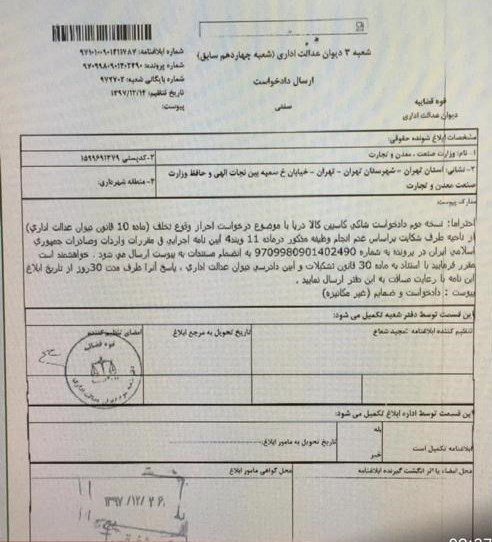 بر اساس اسناد ارسالی وزارت صمت، دیوان عدالت اداری با شکایت صاحب کالا در خصوص تمدید ثبت سفارش و تأکید بر حقوق مکتسبه، اقدام به صدور رأی بدوی در اوایل سال 1398 کرده است.