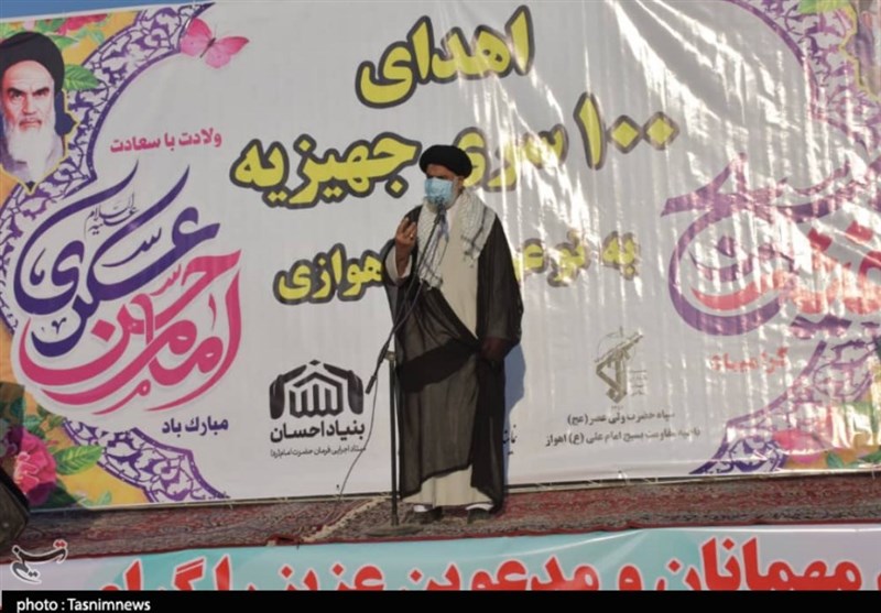 به گزارش خبرگزاری تسنیم از اهواز، به مناسبت ولادت با سعادت امام حسن عسکری (ع) و هفته بسیج با حضور نماینده ولی فقیه در خوزستان و فرمانده سپاه حضرت ولیعصر(عج) 100 سری جهیزیه به نوعروسان اهوازی اهدا شد.