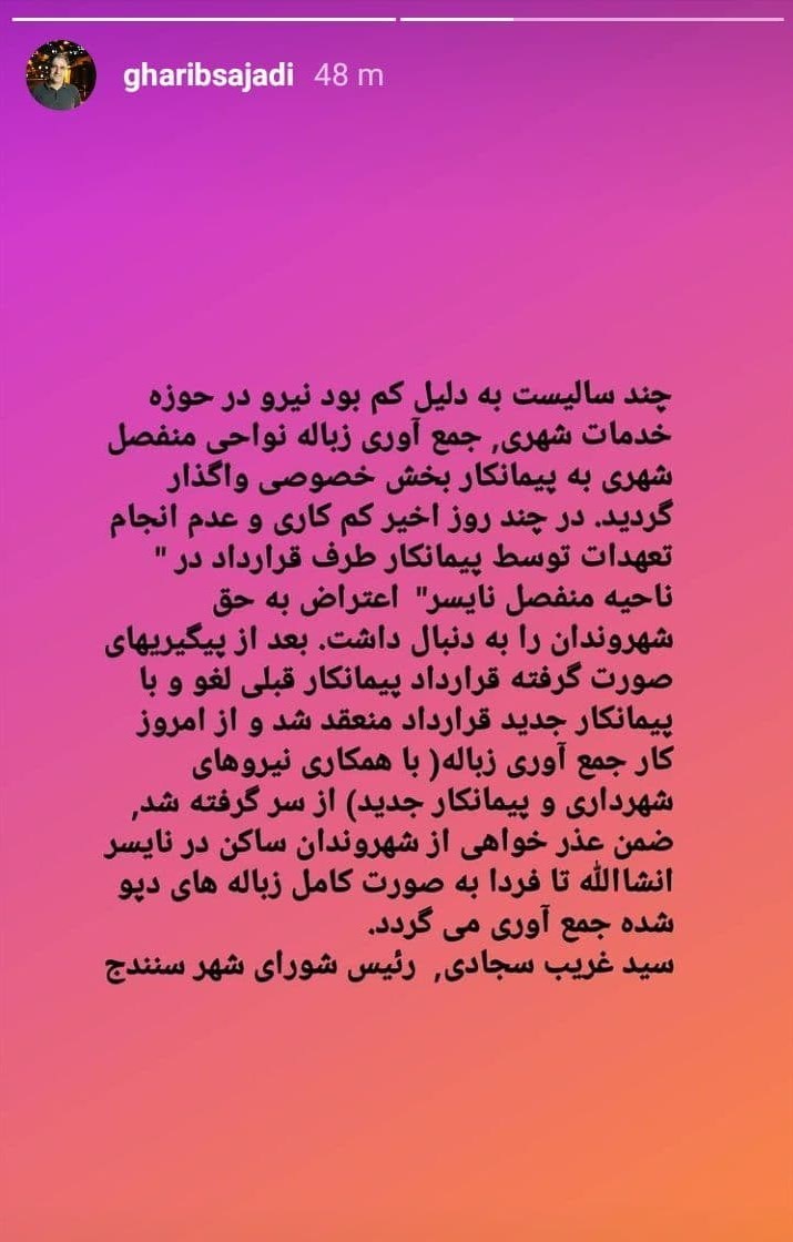 چندساعتی پس از انتشار گزارش تسنیم، سید غریب سجادی رئیس شورای اسلامی شهر سنندج نیز در فضای مجازی مانور خبری به راه انداخت و اعلام کرد: "ان شاء الله تا فردا (6 آذرماه) بهصورت کامل زبالههای دپوشده جمعآوری میشود".