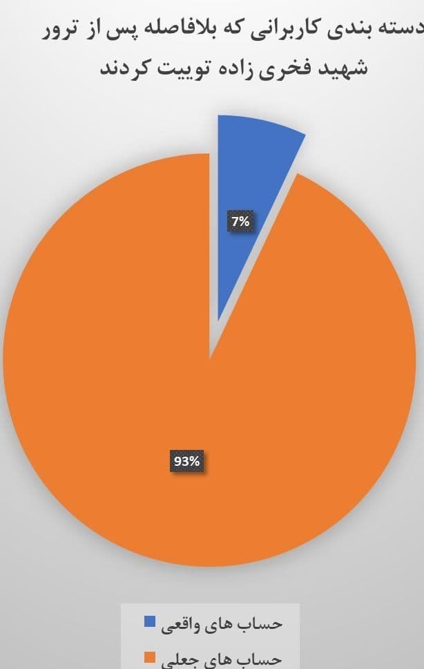 جالب‌تر اینکه نزدیک ٩٣ درصد این توئیت‌ها مربوط به حساب‌های مجعول و بی‌شناسنامه با سابقه کمتر از یک سال و عمدتاً با منشأ خارجی بوده است.