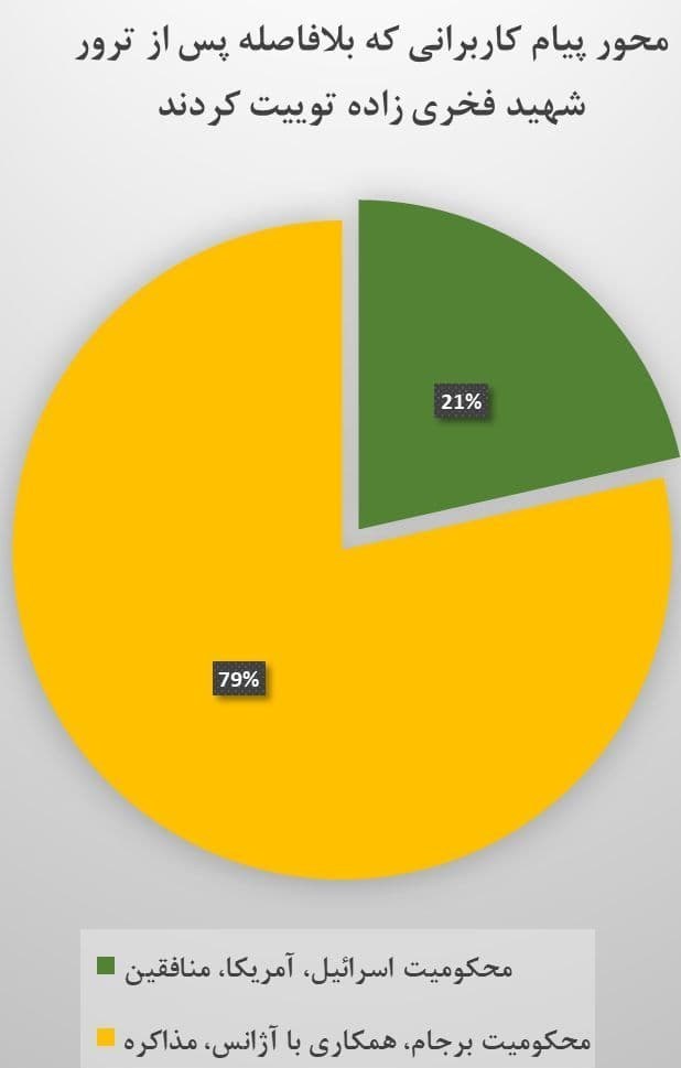 بررسی و تحلیل کلیدواژه‌های 10هزار توئیتی که در چند ساعت اول پس از ترور در فضای مجازی در این زمینه منتشر شد نشان می‌دهد که حدود ٧٩ درصد توئیت‌ها جهت‌گیری برای اختلاف‌افکنی داخلی (مخالفت با برجام، همکاری با آژانس بین‌المللی انرژی اتمی و مذاکره) تدوین شده و تنها ٢١ درصد آنها علیه آمران و عاملان این جنایت وحشیانه بوده است.