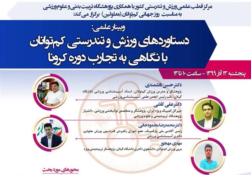 اساتید برجستهای همچون: دکتر حسن دانشمندی «پژوهشگر و مدرس ورزش کمتوانان و نایب رئیس انجمن علمی آسیبشناسی ورزشی»، دکتر علی کاشی «دبیرکل المپیک ویژه ایران و پژوهشگر و متخصص توانبخشی ورزشی»، دکتر محمدرضا محمودخانی «رئیس آکادمی ملی پارالمپیک و عضو شورای راهبردی فدراسیون ورزش معلولین» و آقای مهدی مهجور «مربی ورزش کمتوانان و پژوهشگر تربیتبدنی ویژه» در گرایش و تخصصهای علمی مرتبط از سخنرانان این وبینار یک روزه هستند.