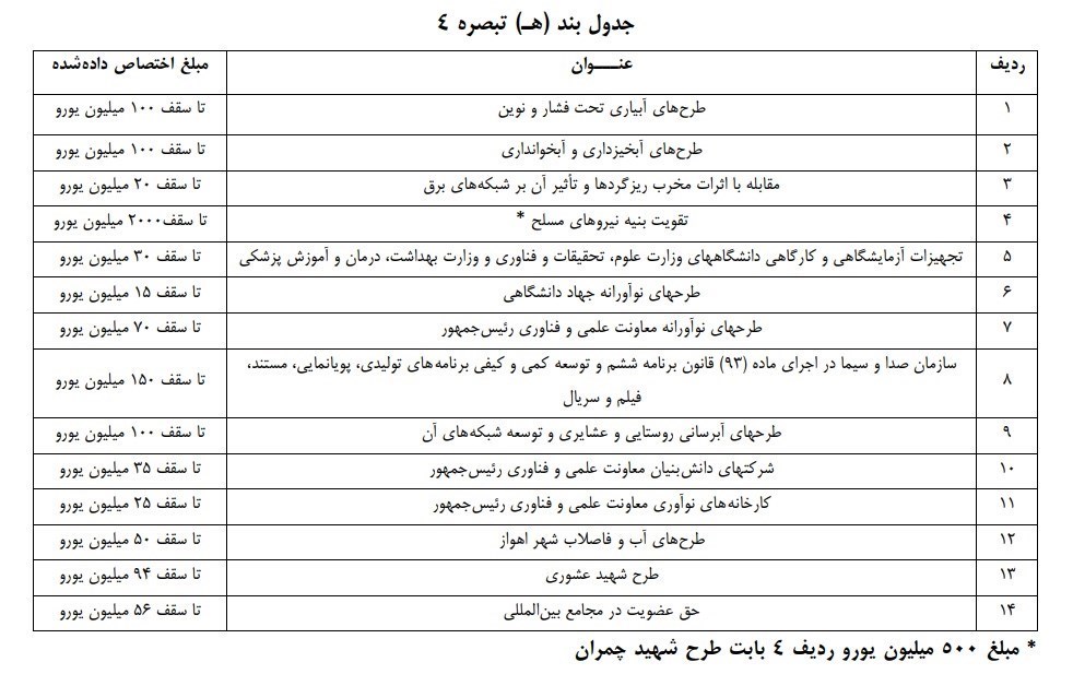 در این جدول که مربوط به تسهیلات صندوق توسعه ملی است، مبلغ 200 میلیون یورو به منظور تقویت بنیه دفاعی کشور در نظر گرفته شده است.