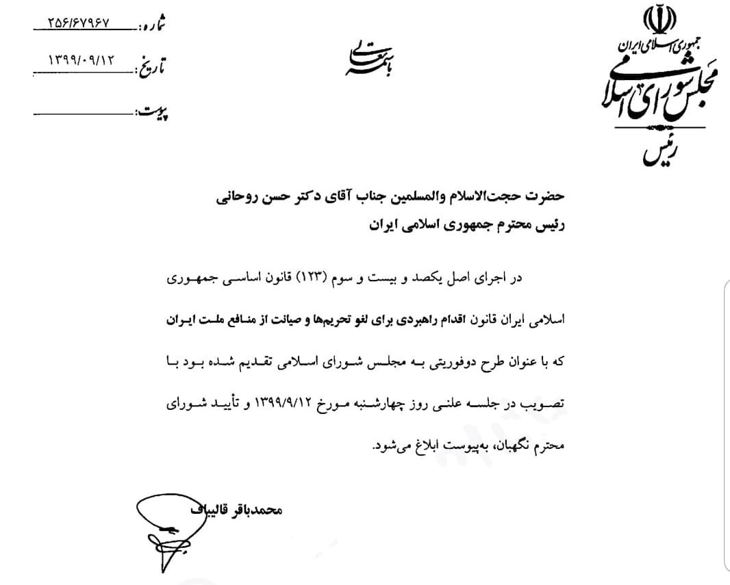 محمد حسین فرهنگی عضو هیئت رئیسه مجلس در گفتوگو با خبرنگار سیاسی خبرگزاری تسنیم، از ابلاغ قانون لغو پروتکل الحاقی به دولت خبر داد و گفت: محمدباقر قالیباف رئیس مجلس شورای اسلامی طی نامهای به حسن روحانی رئیس جمهور قانون اقدام راهبردی برای رفع تحریمها و صیانت از منافع ملت ایران را ابلاغ کرد.