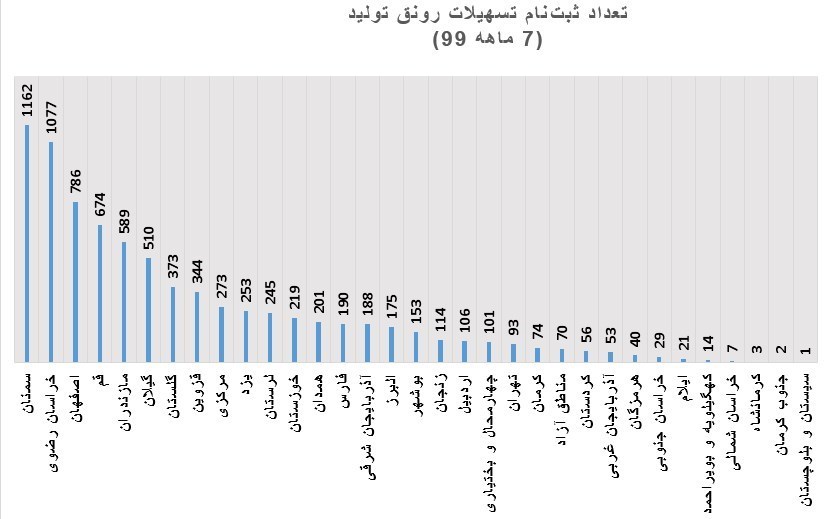 در بین استانهای کشور استان سمنان (1162 فقره)، خراسان رضوی (1077 فقره) و اصفهان (786 فقره) بیشترین و استان سیستان و بلوچستان (1 فقره)، جنوب کرمان (2 فقره) و کرمانشاه (3 فقره) کمترین میزان ثبتنامیها را طرح رونق تولید داشتهاند. استان فارس با 190 فقره رتبه چهاردم را در این زمینه داشته است.