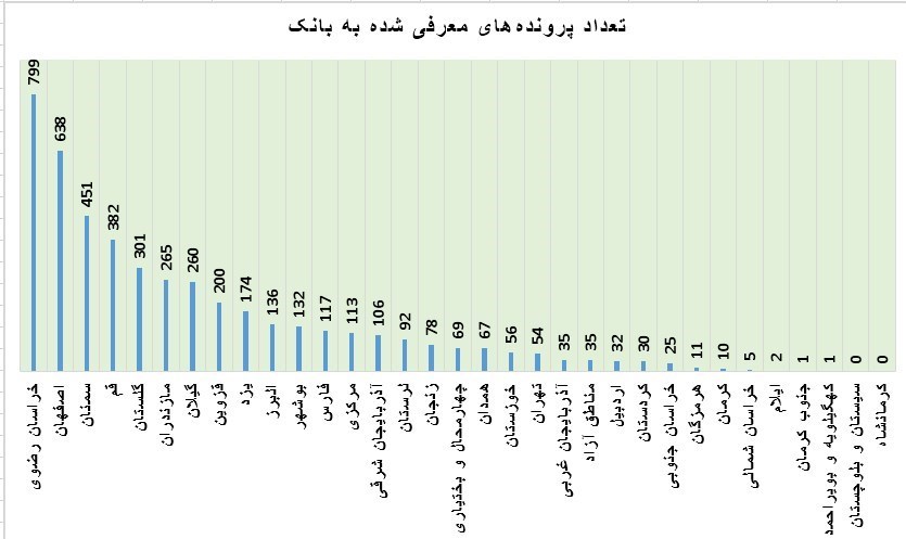 در بین استانهای کشور استان خراسان رضوی (799 فقره)، اصفهان (638 فقره) و سمنان (451 فقره) بیشترین و استان کرمانشاه و سیستان و بلوچستان (0 فقره) و کهگیلویه و بویر احمد و جنوب کرمان (1 فقره) و ایلام (2 فقره) کمترین تعداد ارجاع پرونده معرفی به بانک را بین استانهای کشور داشتهاند. استان فارس با 117 فقره پرونده معرفی شده به بانک (61.5 درصد ثبتنامیها)در رتبه دوازدهم در این زمینه قرار دارد.