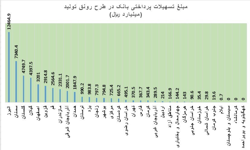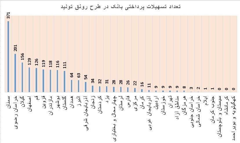 بیشترین مبلغ تسهیلات پرداختی رونق تولید مروبط به استان البرز، سمنان و گلستان و کمترین مبلغ مربوط به استان ایلام، جنوب کرمان و خراسان شمالی بوده است. میزان تسهیلات پرداختی فارس 367 میلیارد ریال بوده است.