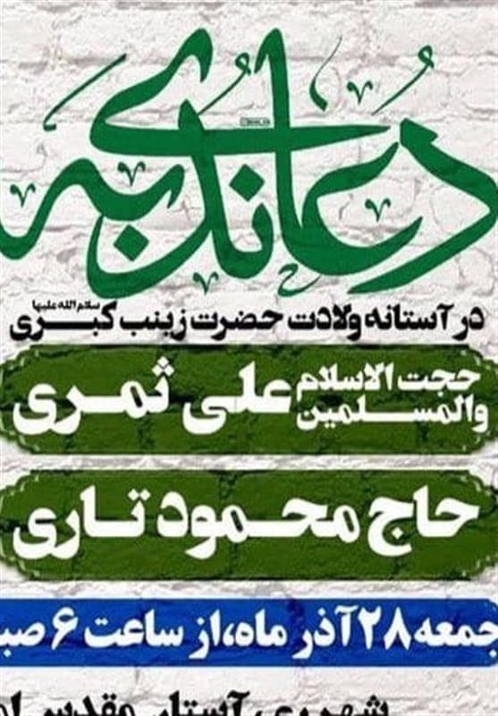 به گزارش خبرنگار فرهنگی خبرگزاری تسنیم،  مراسم قرائت دعای ندبه هیأت رزمندگان اسلام این هفته در آستانه میلاد حضرت زینب(س) در امامزاده عبدالله شهرری برگزار می‌شود. در این مراسم، حجت‌الاسلام علی ثمری سخنرانی و  محمود تاری قرائت دعا خواهد داشت.