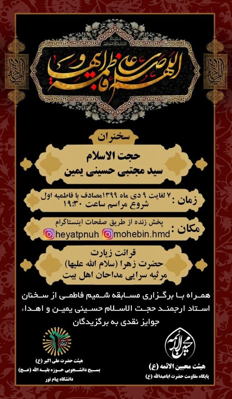 به گزارش خبرگزاری تسنیم از همدان، اگرچه با شیوع کرونا برنامه هیئتهای مذهبی در مساجد و تکایا ممنوع شده است اما هیئتهای مذهبی همدان با فرا رسیدن ایام عزاداری زهرای مرضیه (س) خیمههای عزا را در فضای مجازی بر پا کرده و میزبان عزادارانند.