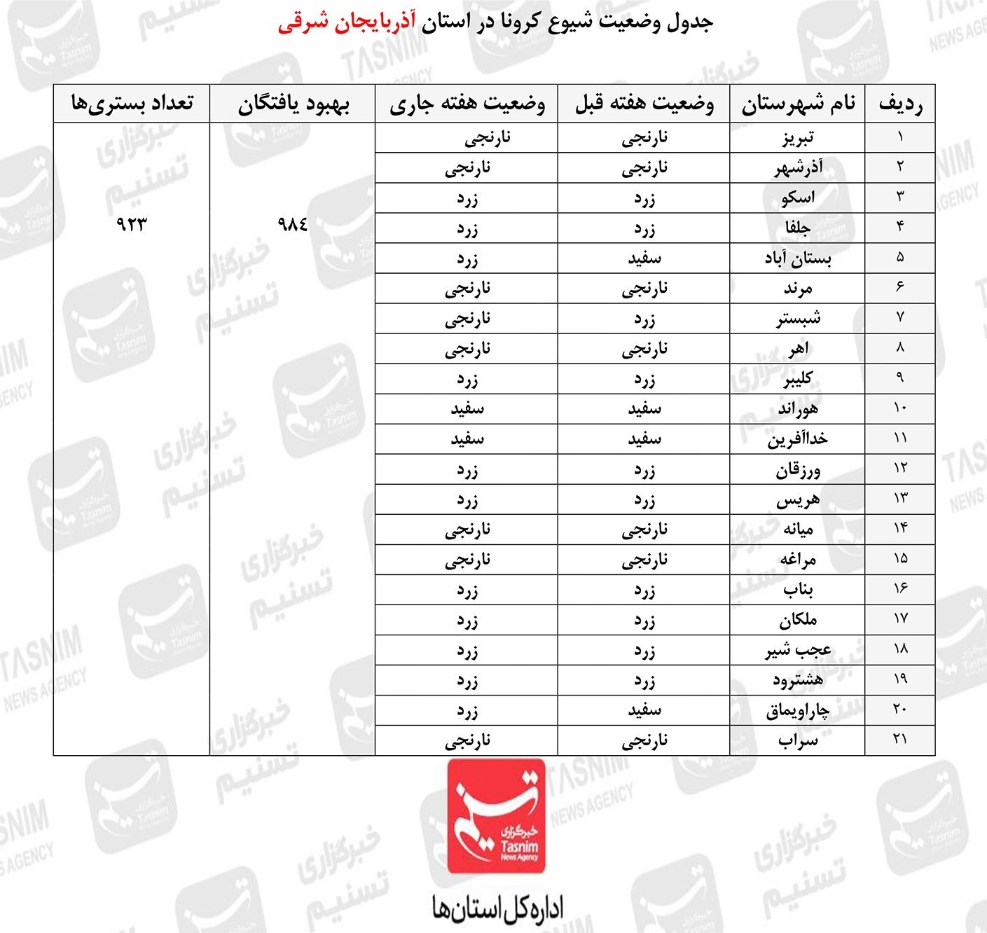 به گزارش خبرگزاری تسنیم از تبریز، بررسی آمارهای منتشر شده از وضعیت شیوع کرونا در استان آذربایجان شرقی نشان دهنده این نکته است که همکاری و مشارکت مردمی در رعایت پروتکلهای بهداشتی آنطور که شایسته مدیریت بحران کرونا است؛ نبوده و بعضاً علیرغم تعیین محدودیتهای خاص از سوی ستاد ملی کرونا وضعیت شهرستانهایی در این استان به سمت بدتر شدن پیش رفته است.
