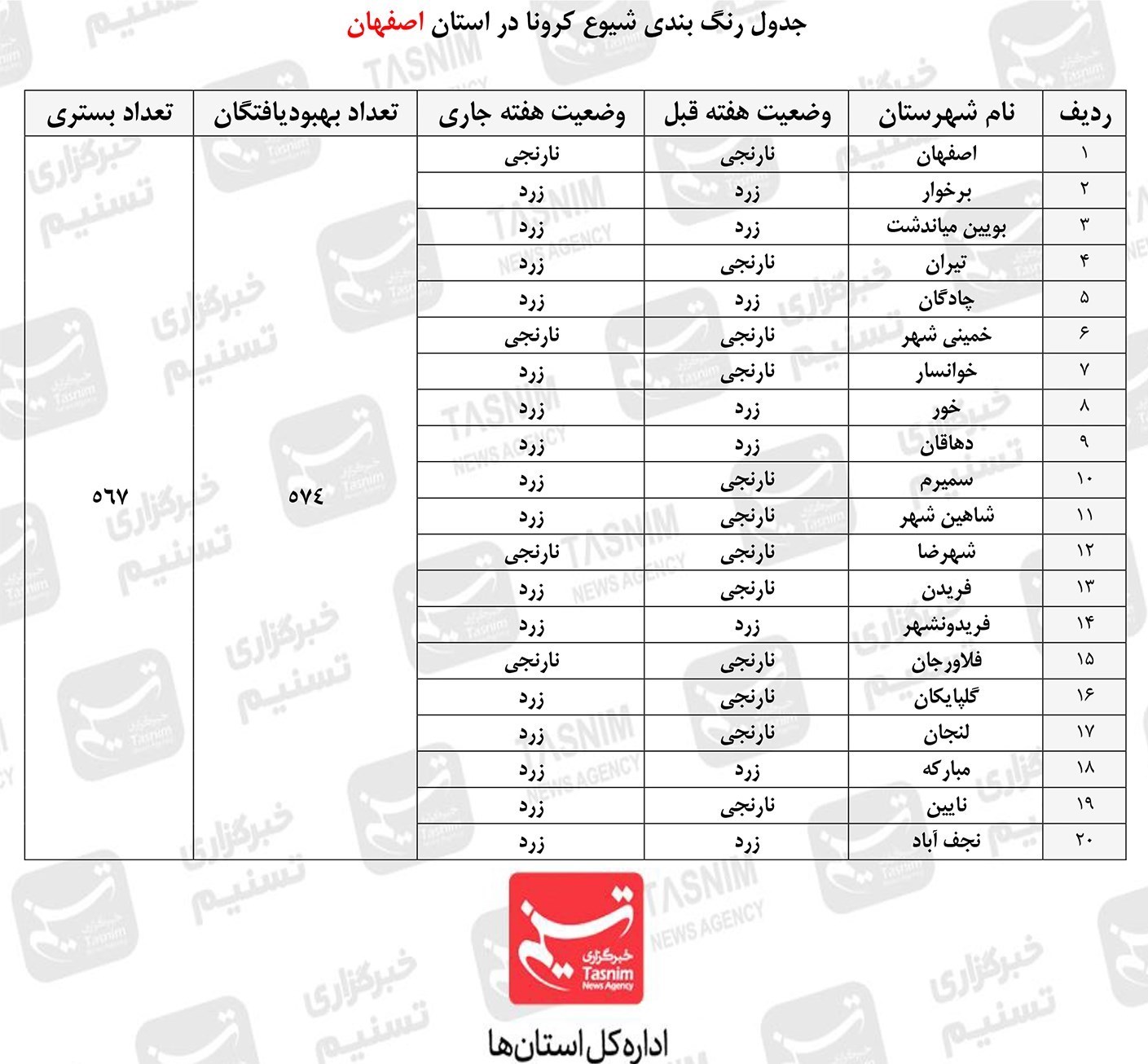 البته کمرنگ شدن وضعیت نگران کننده در شهرستانهای این استان به گونه بود که همچنان برخی از آنها به دلیل ثابت سیر همهگیری در آن مناطق نارنجی باقی ماندند به صورتی که شاخصترین شهرستانها عبارتند از اصفهان به عنوان مرکز استان، خمینیشهر، شهرضا و فلاورجان.
