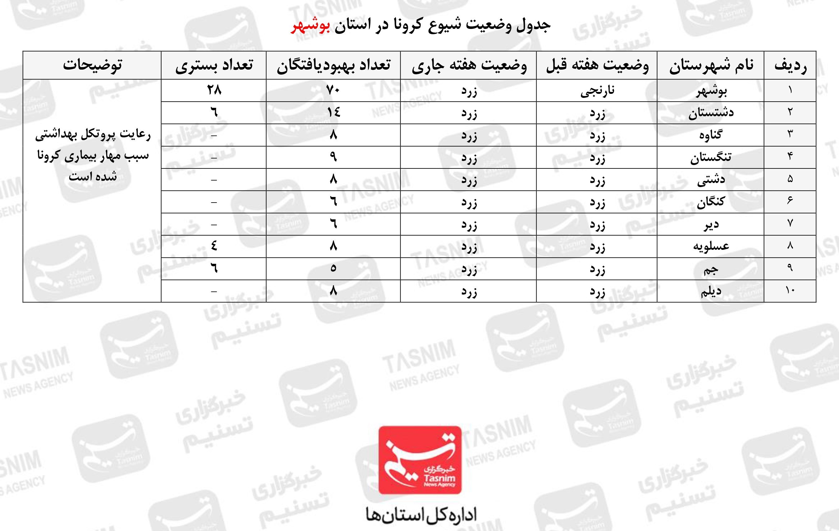 تاز‌ه‌ترین وضعیت کووید 19 در استان بوشهر| محدودیت‌های اثربخش موج سوم را مدیریت کرد / پروتکل‌ها را جدی بگیرید+ جدول