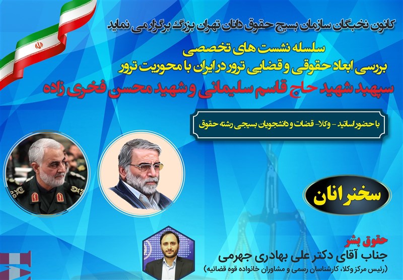 به گزارش خبرنگار قضائی خبرگزاری تسنیم، نخستین نشست از سلسلهنشستهای تخصصی بررسی ابعاد حقوقی و قضائی ترور در ایران با محوریت ترور شهیدان "قاسم سلیمانی" و "محسن فخریزاده" بعد از ظهر امروز دوشنبه 8 دیماه، با حضور و سخنرانی علی بهادریجهرمی، رئیس مرکز وکلا، کارشناسان رسمی و مشاوران خانواده قوه قضائیه برگزار شد.