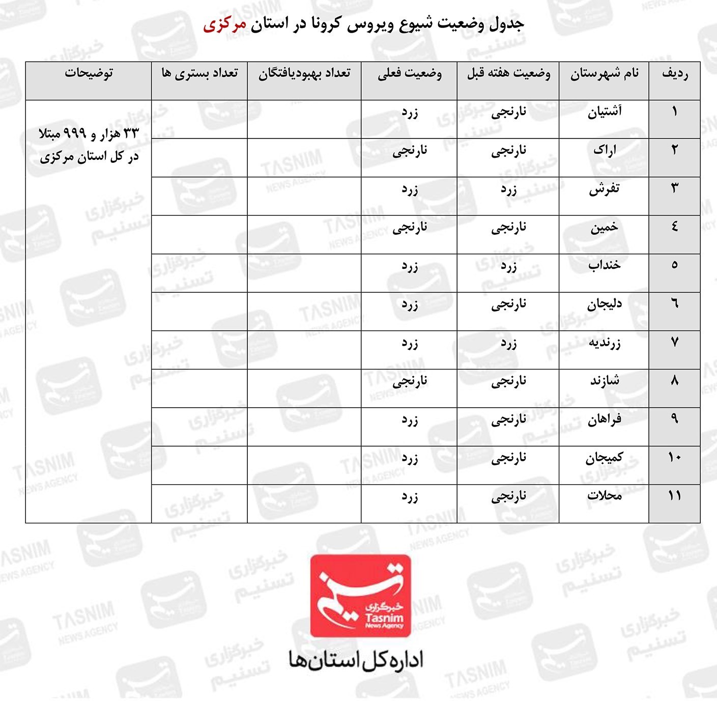 این درحالیست که به جز اراک، شازند و خمین که در وضعیت نارنجی هستند سایر شهرهای استان مرکزی درحالی حاضر وضعیت زرد را تجربه میکنند.
