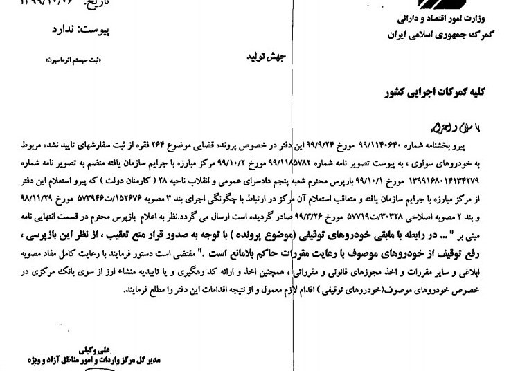 در ادامه این بخشنامه آمده است، نظر به اعلام بازپرسی، قرار منع تعقیب و رفع توقیف از سایر خودروهای سواری موجود در گمرکات کشور با رعایت مقررات حاکم بجز 264 فقره ثبت سفارش تایید نشده بلا مانع است.