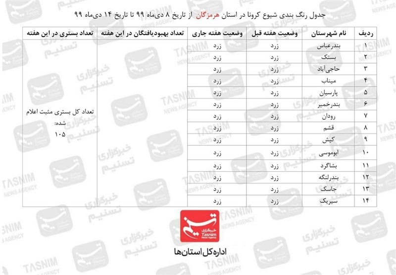 به گزارش خبرگزاری تسنیم از بندرعباس، در طول هفته گذشته 172 بیمار جدید مبتلا یا مشکوک به کرونا در استان هرمزگان بستری شدهاند که نسبت به هفته گذشته، افزایش 8 درصدی داشته و در حال حاضر 105 بیمار کرونایی در استان بستری بوده که 31 تن از آنان در ICU و وضعیت 9 بیمار وخیم است.