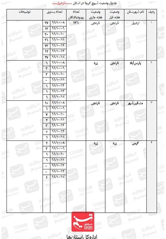 در حال حاضر اردبیل بیشترین آمار فوتیها را به خود اختصاص داده و به جز شهرستانهای اردبیل و مشگینشهر بقیه شهرستانها در وضعیت زرد قرار گرفتهاند و طی 24 ساعت گذشته 36 بیمار جدید مبتلا به کرونا در مراکز درمانی استان بستری شدهاند که بیشترین بستری مربوط به شهرستان اردبیل است و مجموع بیماران بستری شده به رقم 232 نفر رسید.