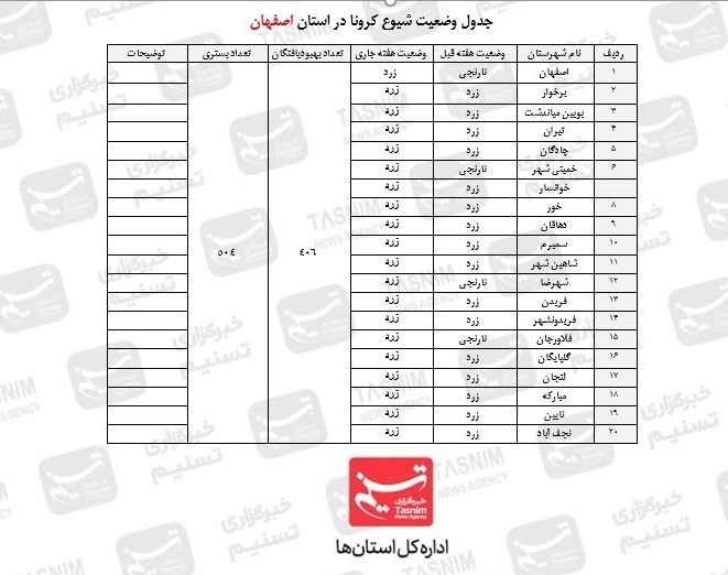 براساس آمار علوم پزشکی اصفهان، تعداد بهبود یافتگان در تاریخ 8دی الی 14 دی 406 نفر و تعداد بستری شدگان 504 نفر اعلام شده است.