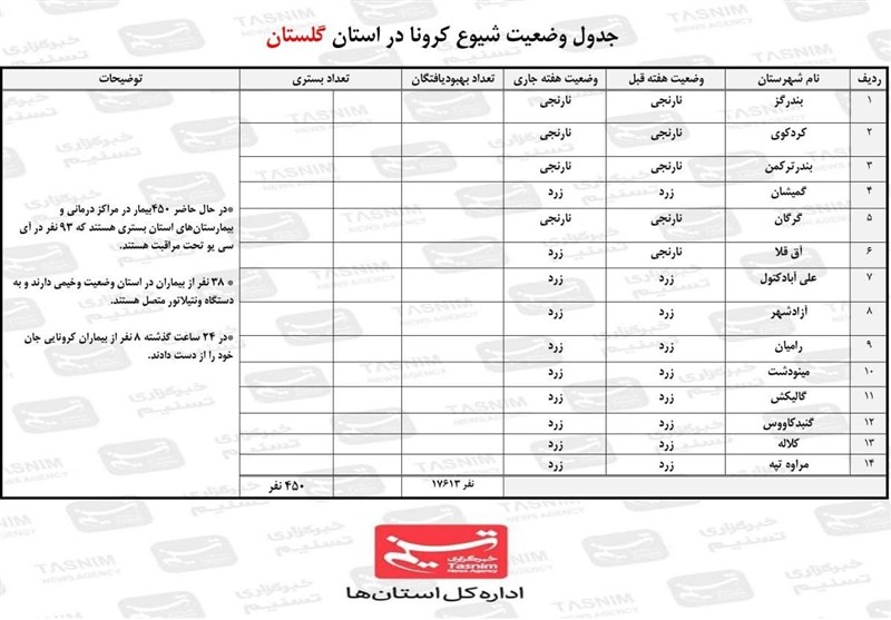 برهمین اساس شهرهای کردکوی، بندرگز، بندرترکمن و گرگان در وضعیت نارنجی و سایر شهرها از جمله گنبدکاووس در شرایط زرد هستند. با اینحال مسئولان بهداشت و درمان استان نسبت به عادی انگاری و برگزاری تجمعات و مراسمات مختلف به ویژه عروسیها هشدار دادند و تأکید کردند عدم توجه به این موارد پیک چهارم کرونا را در بهمن و اسفندماه رقم خواهد زد.