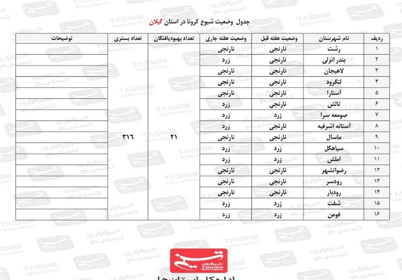 شهرستانهای بندرانزلی و تالش هفته گذشته در وضعیت نارنجی بوده و این هفته به وضعیت زرد کرونایی رسیدند که این نشان از رعایت پروتکلهای بهداشتی به نحو احسن از سوی مردم این شهرستانها است لذا شهرستانهای صومعه سرا ، سیاهکل ، املش، شفت و فومن همواره از هفته گذشته تا این هفته در وضعیت زرد قرار دارند.