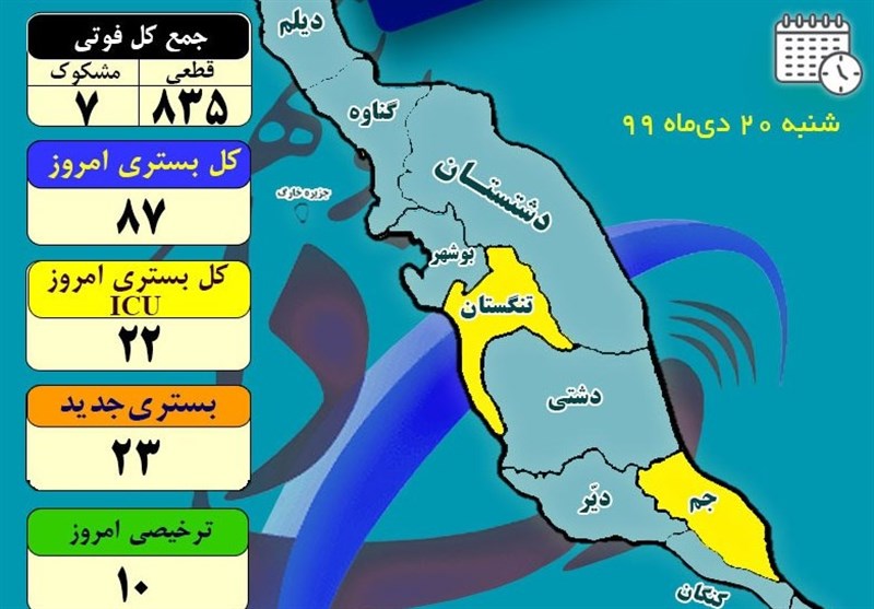 رئیس دانشگاه علوم پزشکی بوشهر افزود: شهرستانهای بوشهر، دشتی، دیر، دشتستان، کنگان، عسلویه، دیلم و گناوه در وضعیت آبی یا کم خطر کرونایی قرار دارند.