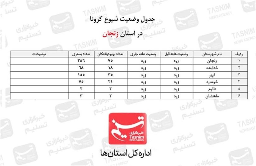 تاز‌ه‌ترین وضعیت شیوع کووید 19 در استان زنجان| اجرای طرح شهید سلیمانی سیر صعودی گسترش بیماری را متوقف کرد + جدول