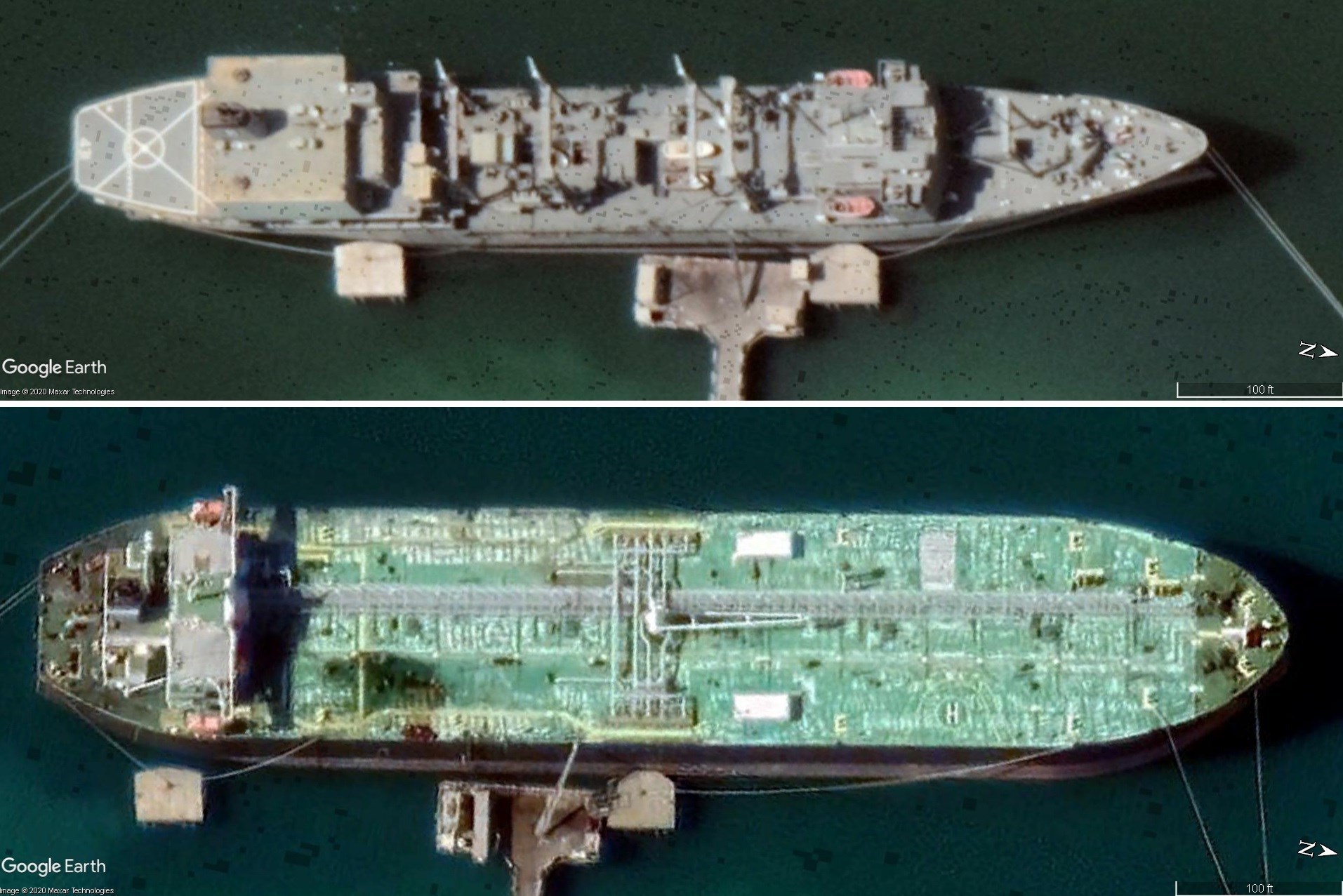 مقایسه ابعاد ناو سرفرماندهی خارک به عنوان بزرگترین شناور نظامی غرب آسیا (تصویر بالا) و ناوبندر مکران پیش از شروع تغییرات (تصویر پائین)