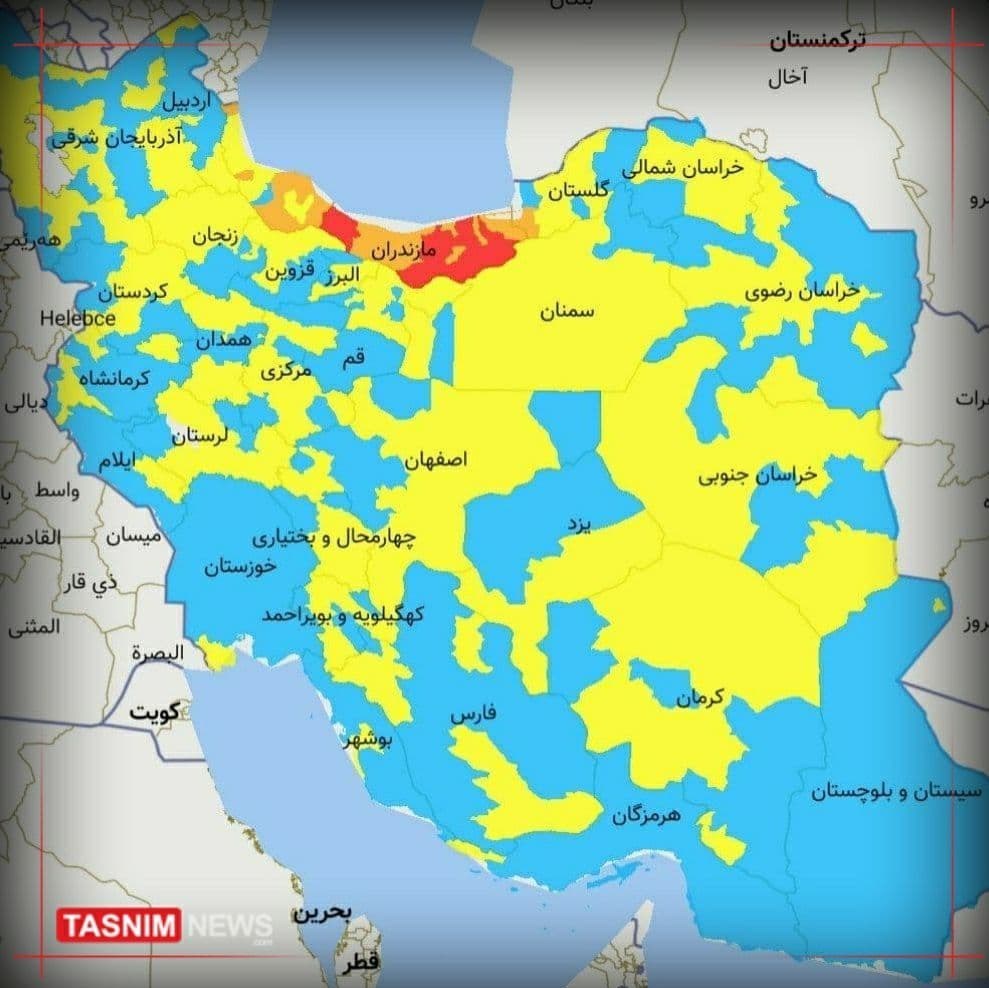 در این آمارها اعلام شده که بخش‌هایی از استان مازندران و استان گلستان علی‌رغم اینکه محدودیت‌ها اجرایی شده بود اکنون در وضعیت قرمز کرونایی قرار گرفته‌اند و در تازه‌ترین آمار شهرهای قرمز کرونایی در مازندران به 9 شهرستان رسید و در عین حال 30 شهرستان در وضعیت نارنجی، 219 شهرستان در وضعیت زرد و 192 شهرستان در وضعیت آبی قرار دارند.‌