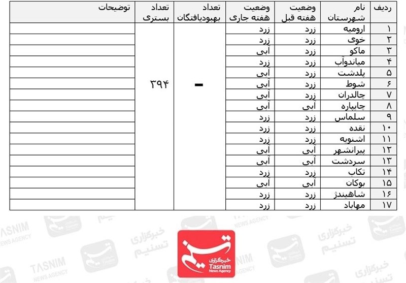 در شهرستانهای پرجمعیت استان همچون ارومیه، خوی، سلماس، میاندوآب و مهاباد وضعیت همچنان زرد است البته باید قبول کرد که زرد شدن همین شهرستانها نیز بسیار امیدوار کننده بوده و باید قدردان کادر بهداشت و درمان بود که توانستهاند شرایط وخیم این شهرستانها را کنترل کرده و از قرمز به نارنجی و از نارنجی به زرد تغییر دهند.