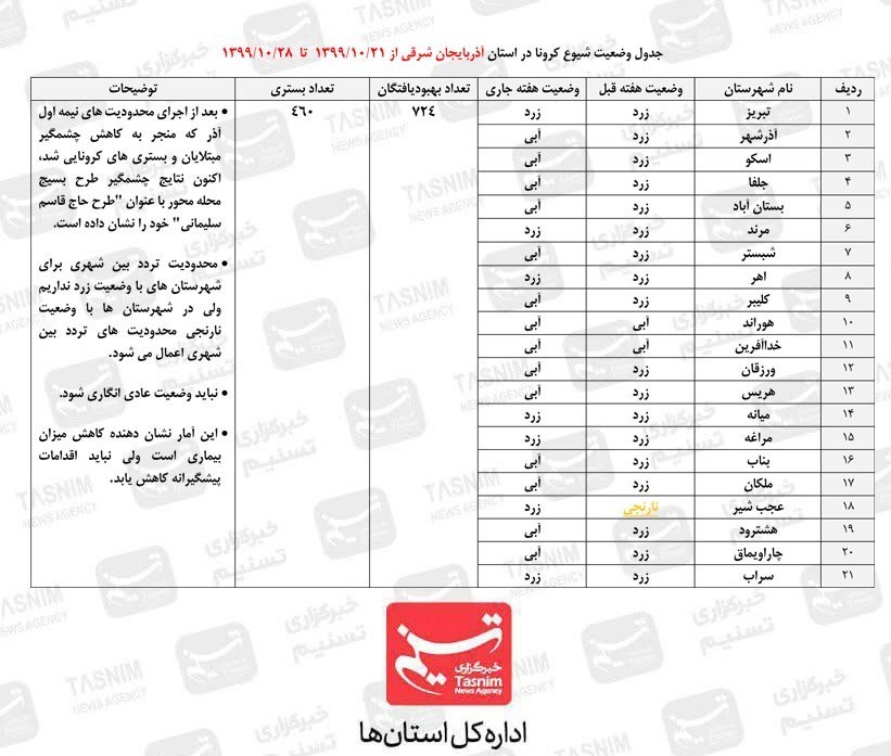 اما یکی از دلایل کاهش ابتلا، طرح محلهمحور شهید حاج قاسم سلیمانی برای مقابله با شیوع کرونا است که بسیج با تمام ظرفیت پای کار آمده و ظرفیت های دولتی هم در این زمینه به کار گرفته شده است و اکنون آذربایجان شرقی را در وضعیت زرد کرونا پایدار کرده که از مجموع 21 شهرستان استان، 12 شهرستان در وضعیت آبی و 9 شهرستان در وضعیت زرد قرار دارند و با اجرای محدودیتها، تعداد بستریهای کرونا در آذربایجان شرقی از حدود یک هزار و 700 نفر به 460 نفر کاهش یافته است.