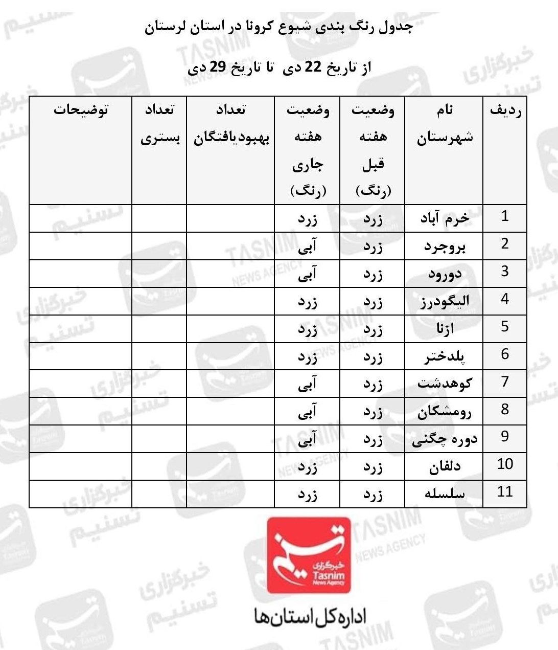 هم اکنون وضعیت کرونایی شهرستانهای بروجرد، دورود، کوهدشت، رومشکان و دوره چگنی آبی و شهرستانهای خرمآباد، ازنا، الیگودرز، پلدختر، سلسله و دلفان زرد است.