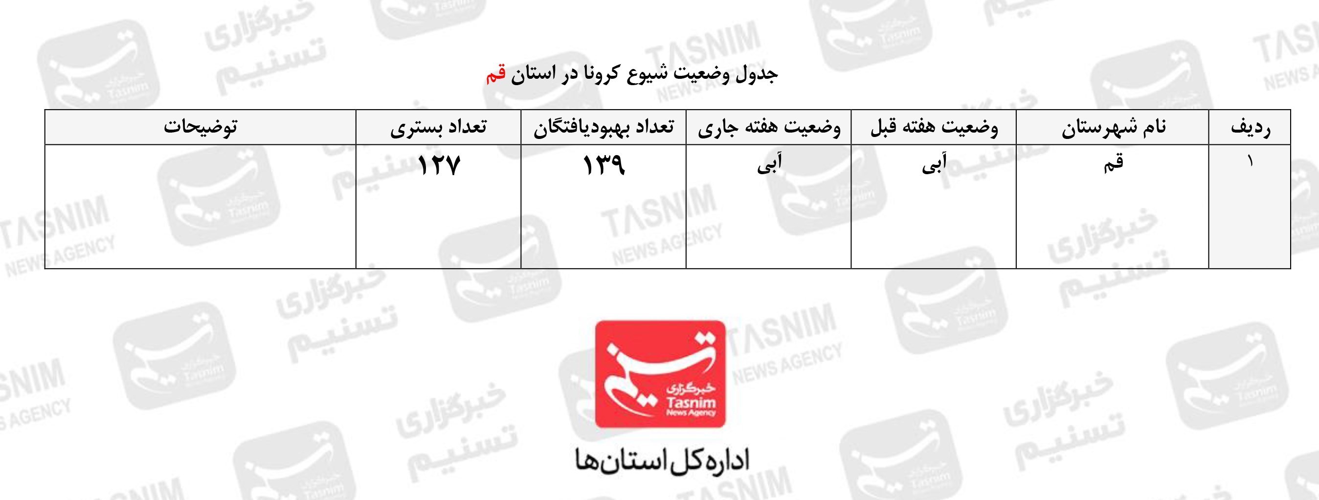 به گزارش خبرگزاری تسنیم از قم، استان قم دومین هفته خود را نیز در شرایط آبی کرونایی سپری کرد و از تاریخ 21 دیماه تا 29 دیماه وضعیت استان به شرح زیر است.