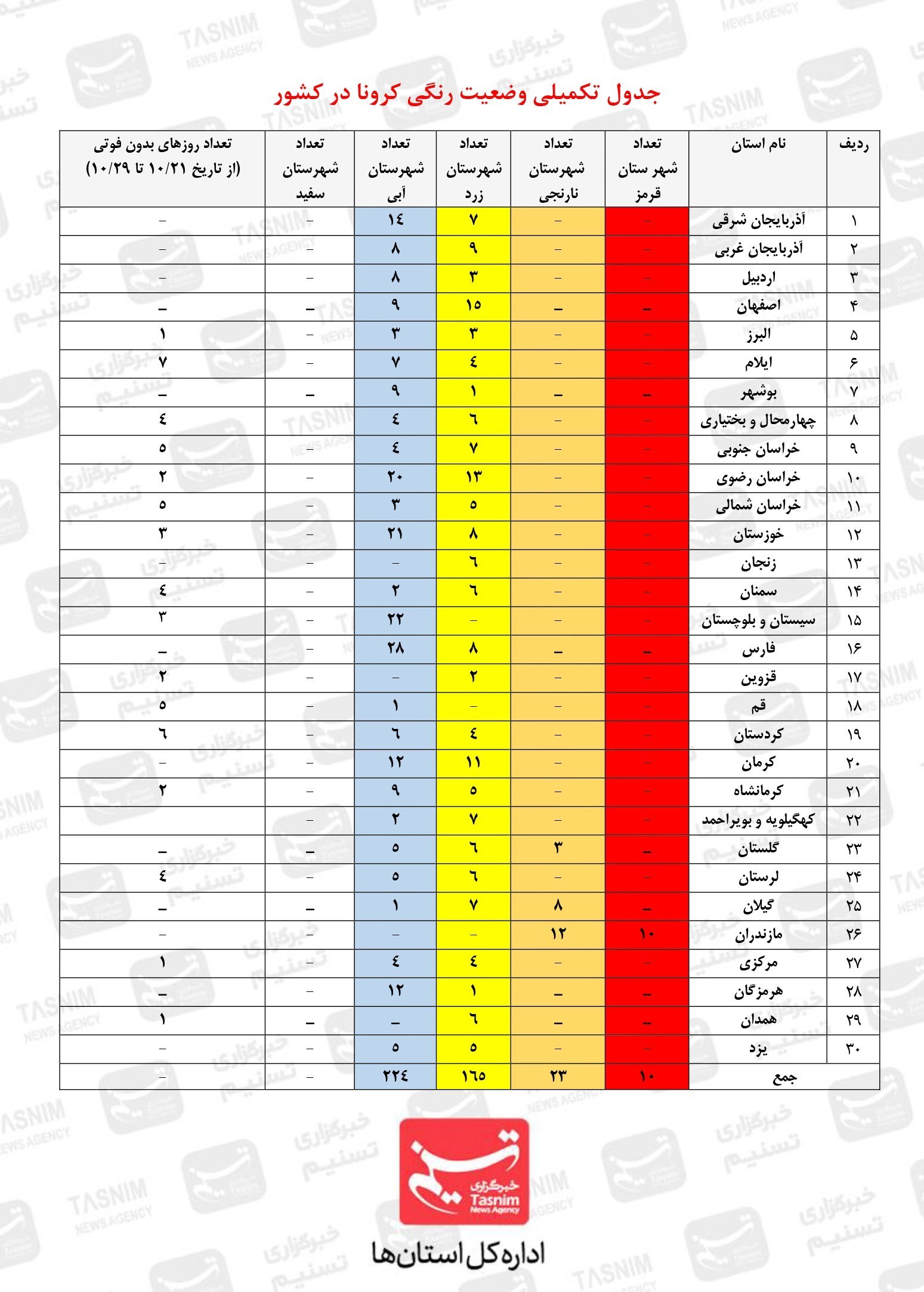 اما در بخش امیدوارکننده اخبار کرونایی هماکنون 165 شهرستان یعنی معادل 39 درصد و 224 شهرستان که معادل 53 درصد کل شهرستانهای کشور هستند بهترتیب در منطقه زرد و آبی رنگبندی کرونا قرار گرفتهاند. در ادامه جدول تفکیکی رنگبندی شهرستانهای کشور آمده است.