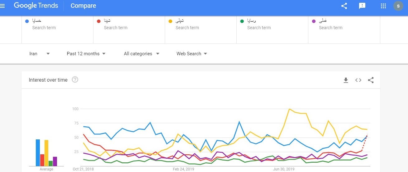 در تصویر فوق نموداری از وضعیت سابقه جستوجوها در نمادهای فملی، وساپا، شپلی، شپنا و خساپا با هم مقایسه شدهاند. دقت داشته باشید که این اطلاعات قابلیت فیلتر کردن بر اساس منطقه، زمان، دستهبندی و نوع محتوا را نیز دارد.