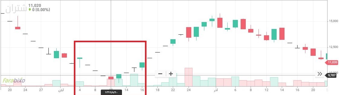 یکی از مهمترین موارد، همانطور که قبلا نیز اشاره شد، رابطه نمودار گوگل ترندز با نمودار قیمت سهم است. برای مثال نماد شتران در تاریخ 20 آبان 1399 را در نظر بگیرید.
