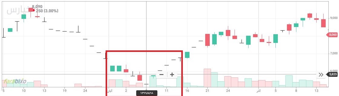 در مثالی دیگر سهام شرکت پارس خودرو (خپارس) را در تاریخ 18 آبان 1399 بررسی می کنیم؛ نمودار قیمت این سهم پس از طی یک مسیر نزولی، در تاریخ مذکور به کف قیمت خود رسیده است.