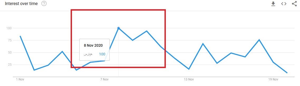 حال اگر نمودار گوگل ترندز این سهم را در بازه منتهی به 18 آبان (8 نوامبر) بررسی کنیم، مجددا شاهد رابطه عکس نمودار قیمت سهم با نمودار گوگل ترندز آن هستیم.