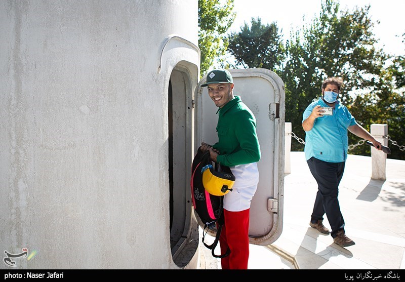 وی بههمراه همسر و چند نفر دیگر از اعضای تیم خود در میدان بسیج اکباتان حضور یافت و برای پرش از ارتفاع، از یک نردبان آتشنشانی استفاده کرد.
