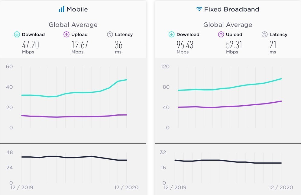 طبق این گزارش در ماه دسامبر 2020 متوسط سرعت دانلود اینترنت موبایل در جهان 47.20 و آپلود آن 12.67 مگابیت بر ثانیه بوده است. از سوی دیگر متوسط سرعت دانلود اینترنت ثابت جهان 96.43 و سرعت آپلود آن 52.31 مگابیت بر ثانیه بوده است.