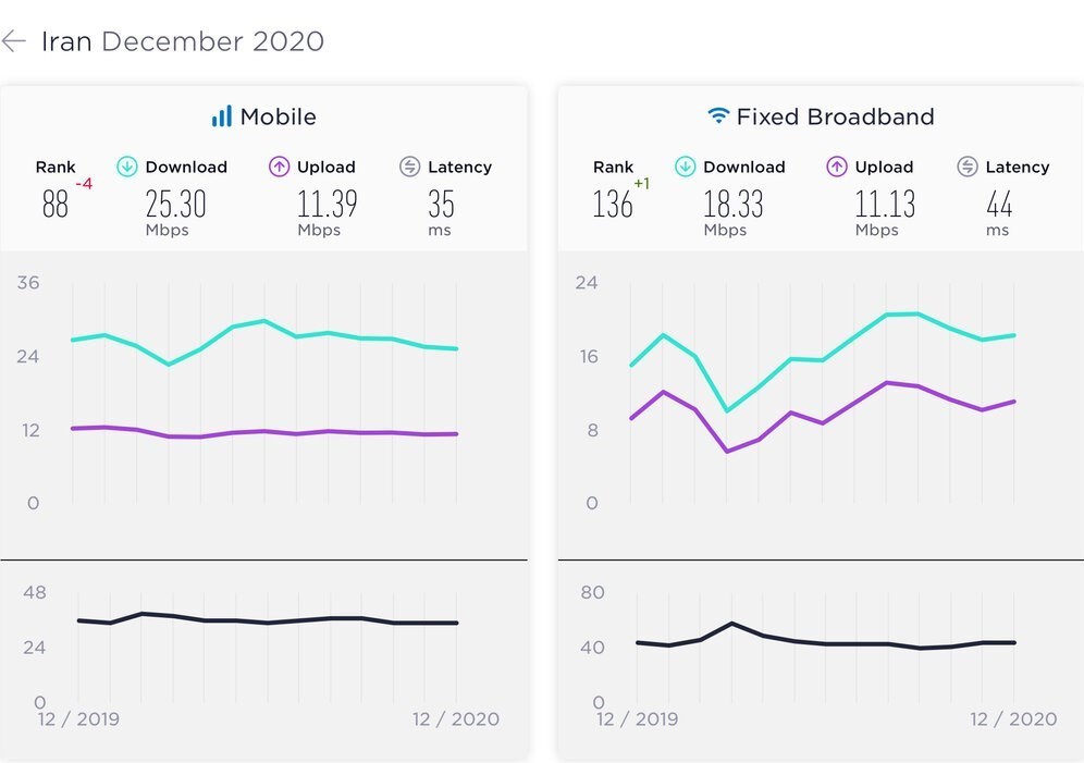 به گزارش گروه رسانه های خبرگزاری تسنیم به نقل از مهر، وب سایت Speedtest.comجدیدترین گزارش خود از سرعت اینترنت کشورهای مختلف جهان در آخرین ماه 2020 میلادی (دسامبر) را منتشر کرده است.