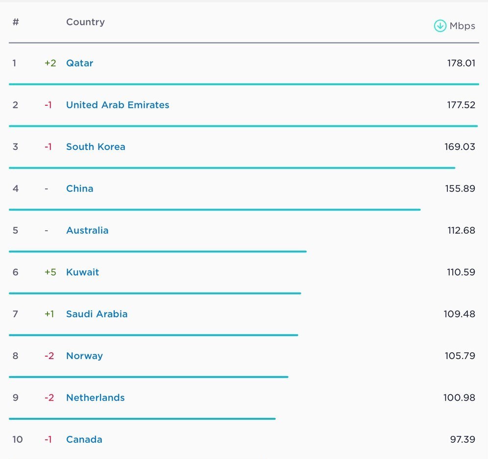 در رده ششم کویت با سرعت اینترنت 110.59 مگابیت بر ثانیه قرار دارد که در مقایسه با ماه گذشته، 5 پله صعود کرده است. در رده هفتم نیز عربستان سعودی با سرعت اینترنت 109.48 مگابیت بر ثانیه قرار دارد.