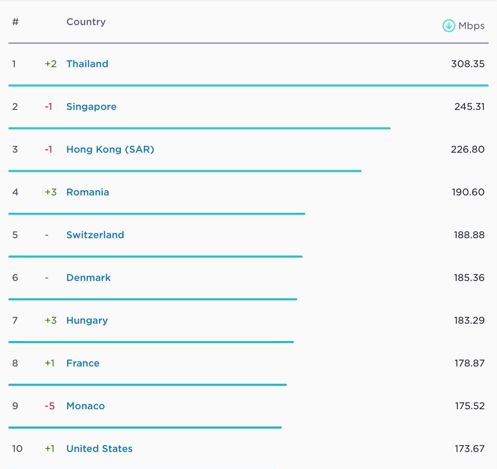 در رده بندی کشورهایی با بیشترین سرعت اینترنت ثابت تغییر جالبی دیده میشود. سنگاپور و هنگ کنگ پس از ماهها صدر نشینی در فهرست هرکدام یک پله سقوط کردهاند. این در حالی است که تایلند با ارائه اینترنت ثابت با سرعت 308.35 مگابیت بر ثانیه و 2 پله رشد در مقام اول قرار دارد.