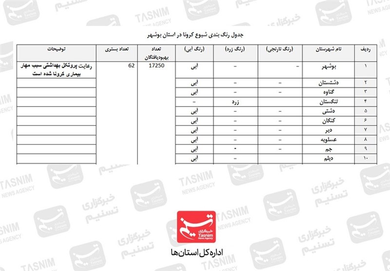 آخرین وضعیت شرایط کرونایی استان بوشهر|90 درصد شهرها در وضعیت آبی قرار گرفت+جدول