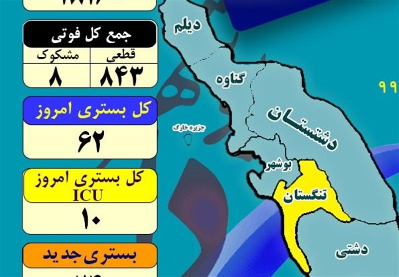 اکنون از 10 شهرستان استان بوشهر 9 شهرستان در وضعیت آبی و یک شهرستان در وضعیت زرد«تنگستان» قرار دارد.